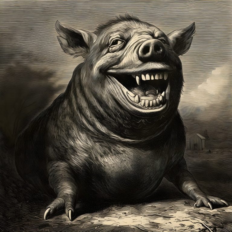 According to some religions, Jesus’ second coming will include him ‘killing the pig’ and ‘breaking the cross.’ The way these verses have been traditionally interpreted has been offensive to Christians, but a simple change in thought can render the words favorable to the ‘correct’ interpretation that does not negate Christianity. Breaking the cross can be thought of in a symbolic fashion. I can see the beauty of the cross as a symbol of Jesus’ giving his life for us, but I can also see it as a symbol of Jesus’ pain and suffering which he took on for the whole world. So, if in the end of days, Jesus comes back and breaks the shackles of suffering of the people, ‘breaking the cross,’ sounds appropriate if thought of like that. I admit, my study of the book with that story is limited to a few verses I read quoted here and there, so I am not in a position to put up an argument on the issue. But imagine if that verse were interpreted instead of as Jesus killing ‘Christians’ (which he very well may do for a lot of them, considering so many ‘Christians’ following Paul to a fault, how many will be tricked by the governments saying Christ’s second coming is a bunch of aliens we all need to shoot at?), a revelations Jesus coming down from heaven with his armies and killing all the pig doctors and pig nurses that promoted the pharmekia of Babylon? I wouldn’t mind seeing a Dees illustration on that.